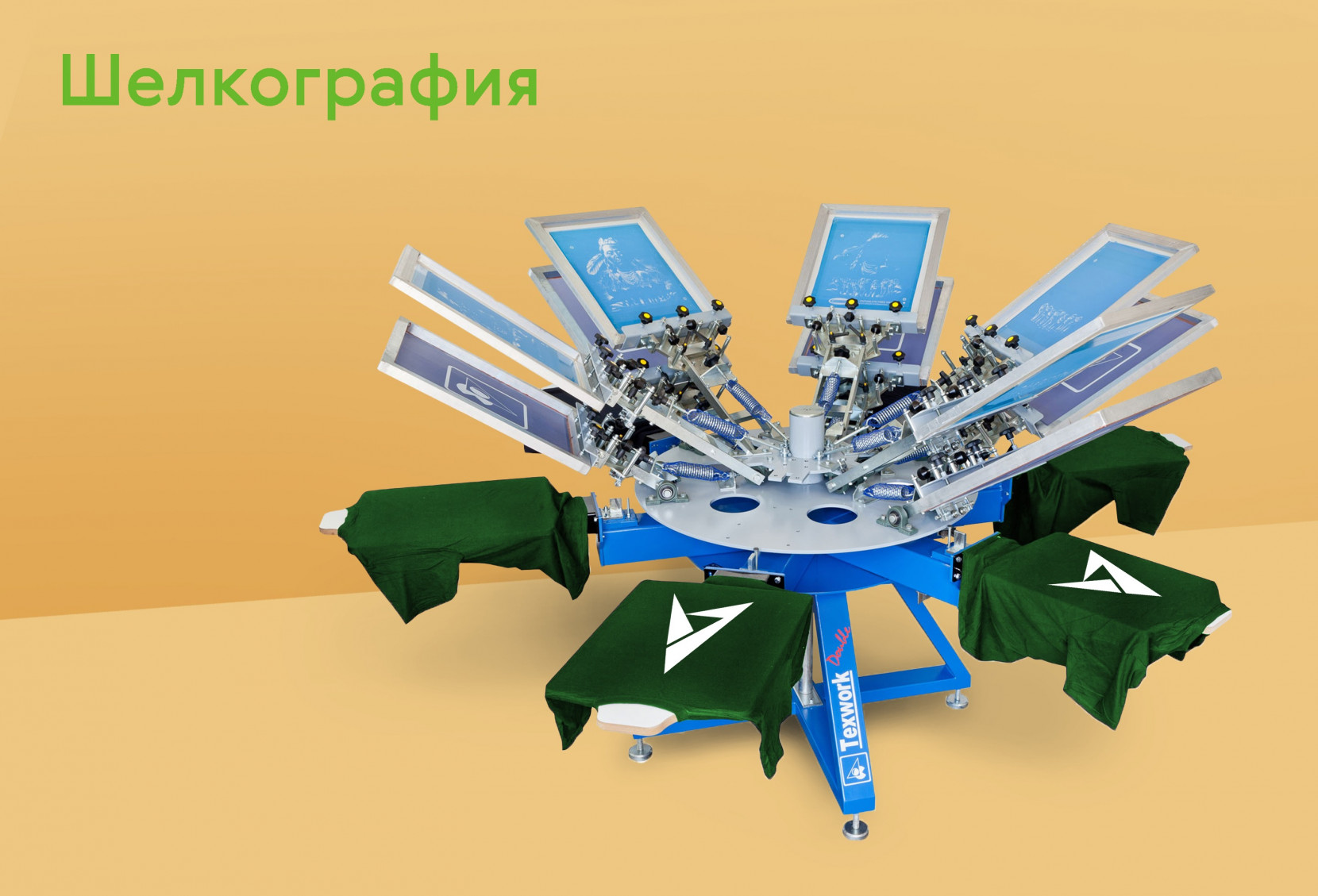 Для печати на текстиле мы используем другой станок — карусель с 6 столами, которая позволяет печатать до 6 цветов на светлых тканях и до 5 цветов на темных. В пластизолевую текстильную краску мы добавляем присадки, которые придают краске пластичность и дополнительный объем.